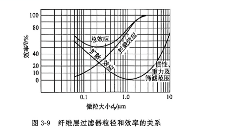 dmax不是定值,对于不同性质的微粒、不同的纤维、不同的滤速,dmax是变化的。图3-9是纤维层过滤器粒径和效率的典型关系。