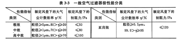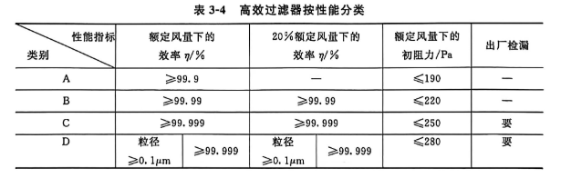 高效过滤器按性能分类见表3-4,其中A、B、C三种高效过滤器的效率规定用钠焰法测定,D种的效率用计数法测定。