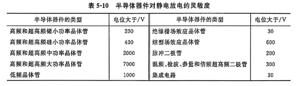 2.静电放电引起的放电电流,可导致诸如半导体元件等破坏和误动作,例如将50块P-MOS电路放在塑料袋内,摇晃数次后,与非门栅严重击穿者计39块,失效率竟达78%,这是因为半导体器件对静电放电十分灵敏,见表5-10;