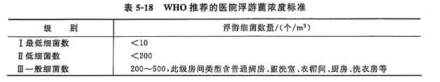 世界卫生组织(WHO)推荐的医院浮游菌浓度标准见表5-18。
