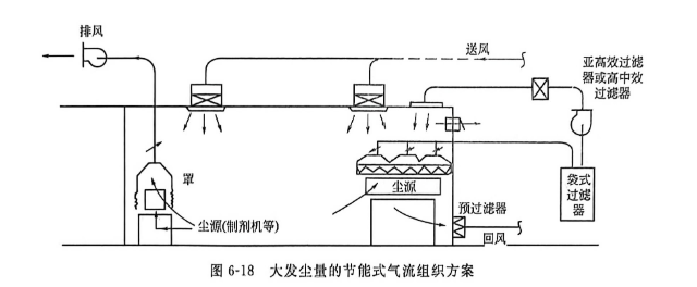 图6-18是对发尘量大的和排气量也大的尘源用罩子和管道先把含尘空气集中处理之后再循环的做法,如果全部排至室外,能量浪费太大。