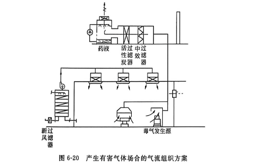 图6-20是在产生有毒气体场合的气流组织方案,此时排风量要经过符合环保要求的处理后排出室外。