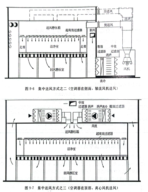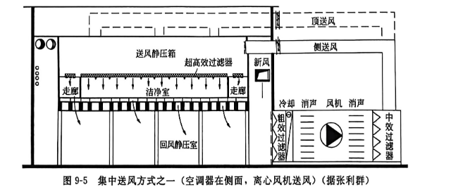 集中送风方式是一种经典的方式。集中送风方式就是将多台空调净化机组集中设置在空调机房内。空调机房可位于洁净室的侧面,也可位于洁净室的顶层。垂直单向流集中送风方式可适用于大面积和洁净度级别高的洁净室。图9-5~图9-7是高级别电子工业洁净室应用垂直单向流集中送风的几种形式。