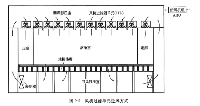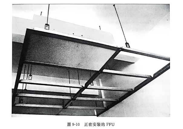 更大。这种送风方式将新风与回风的混合风由单元机组送到洁净室,再从回风静压室经两侧夹道回至送风静压箱与新风混合,见图9-9。FFU安装形式见图9-10。这种方式由于不需要大的空调机房,送风静压箱内的空气处于被风机过滤单元中的风机抽吸的状态,所以箱内呈负压,因此有利于防止过滤器边框的泄漏。但是单元台数太多,一台一个电机,发热量全散在顶棚中,给制冷带来过大的负荷。台数多,叠加噪声大,不便于维修。
