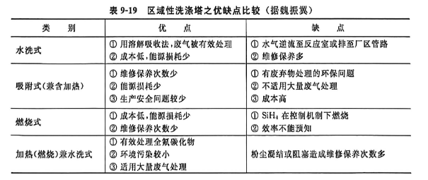 淋水式是一种传统的经典方法,利用水洗方法将可溶于水的废气及粉尘水洗清除。部件有喷嘴、水泵、加碱设备及pH值分析器、进出口压力敏感元件、流量敏感元件、控制监视装置等。图9-46是某半导体工业常用的区域性洗涤塔。表9-19是区域性洗涤塔的优缺点比较。