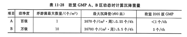 我国GMP(1998)规定百级区(即欧盟GMP的A区)的静态背景环境(即欧盟的B区)为万级,而欧盟GMP的这一规定也为百级。作者等人研究指出,这是没有必要的,仅从沉降菌数量看,欧盟GMPB区(百级)允许数为5个/4h,而通过理论计算(这一计算曾验证过美国宇航局标准)证明在B区为万级时,沉降菌数为5.5个/4h,见表11-28。