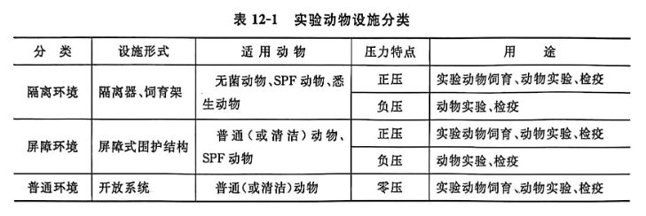 实验动物环境设施实验动物环境设施的任务主要是对实验动物的近邻环境进行控制,可以分为表12-1所列的三类。