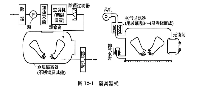 对实验动物设施的具体说明如下。一、隔离器式如图12-1所示,是在装有操作手套的隔离器中饲育动物的装置,用于饲育无菌动物和已知菌动物。内部可保持5级(ISO)以上的洁净度,设置该装置的房间、操作人员不需要考虑无菌要求,但不适于大量饲养。一般用塑料来制造隔离器。