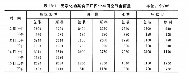 表中上午含菌量最大,是因为刚上班,一夜门窗未开,湿度大,温度也合适;下午含菌量最小,是因为门窗打开,空气流通。如果这些车间使用一般空调器而不是净化空调器,情况还要差。在空调器的冷却器内壁面上、百叶上,都沾有细菌,特别是霉菌孢子。在空调器的送风中有更多的细菌吹出。如一地处郊外的建筑,早上打开门窗,空气清新,测出浮游菌只有200个/m,8点过后,关上门窗,开启空调器,仅10min,浮游菌就达到800个/m3,所以在食品工厂中采用净化空调器是非常必要的。而一般中央空调装置、柜式空调器和风机盘管是非常不宜采用的,它们虽能降低温度但常能“制造”细菌。对于食品工业来说,在空调器回风口加上第八章介绍的超低阻高中效过滤器或亚高效过滤器就可以了。但是为了引进新风和保持正压,新风必须很好地处理,能采用第八章介绍的超低阻节能型高效率(相当于高中效至亚高效)新风净化机组是比较理想的。