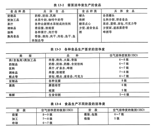 需要洁净环境进行生产的食品,可参见表13-2、表13-3。食品生产不同阶段的洁净度见表13-4。