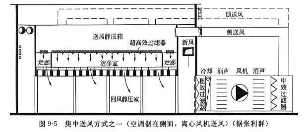 集中送风方式是一种经典的方式。集中送风方式就是将多台空调净化机组集中设置在空调机房内。空调机房可位于洁净室的侧面,也可位于洁净室的顶层。垂直单向流集中送风方式可适用于大面积和洁净度级别高的洁净室。