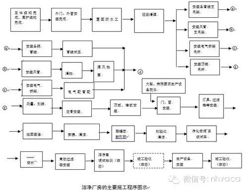 (三)洁净厂房的施工安装需各专业、多工种密切配合,按具体工程实际情况,制定施工安装程序和计划进度,循环渐进地完成洁净厂房的施工建造。下图是洁净厂房的主要施工程序图示: