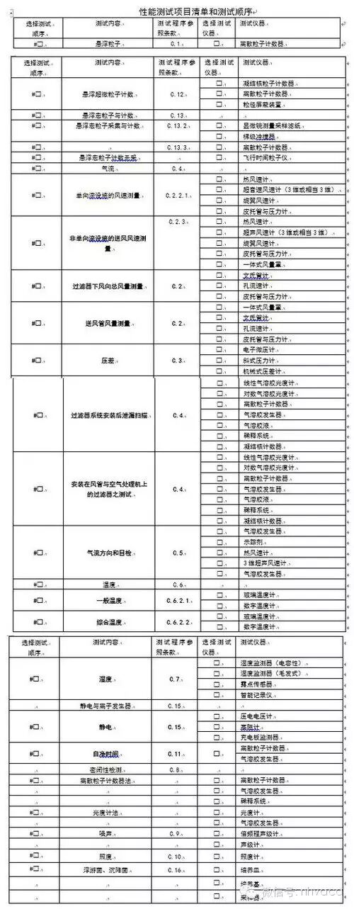1、 性能测试项目和顺序的选择,参照国际标准《洁净室及相关受控环境,第3部份:检测方法》,ISO14644-3中相关要求,根据具体工程的规模、空气洁净度等级、产品生产工艺要求及布置情况、净化空调系统等因素确定,并应由建设方、施工方协商一致填写下表: